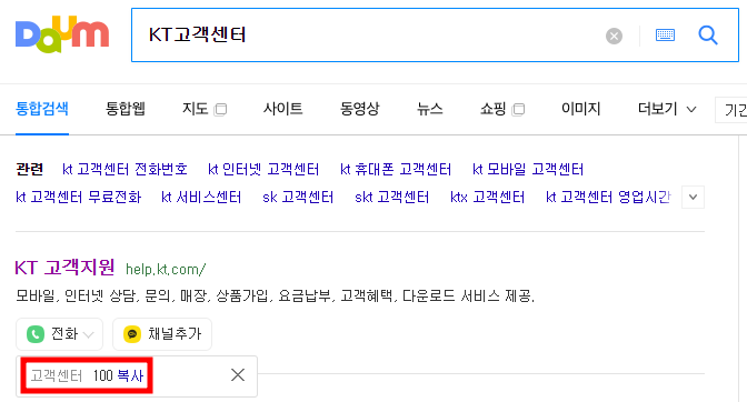 전화하는 방법으로는 KT 고객센터에 직접 전화를 하시면 됩니다. KT 고객센터 번호는 아래의 그림과 같이 검색어 창에 'KT 고객센터'를 검색해주시면 됩니다.