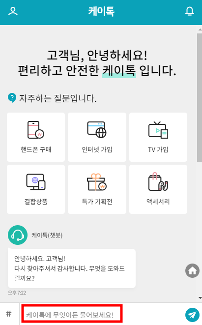 검색어 창에 'KT닷컴'을 검색하여 KT 공식 홈페이지에 들어가주시면 됩니다. KT 공식 홈페이지에 들어가주셨다면, 위의 상단에 '케이톡'을 클릭해주시면 됩니다. 케이톡을 클릭하여 케이톡에 들어가시면 '케이톡에 무엇이든 물어보세요!' 채팅창에 '집전화 해지'를 입력하여 검색해주시면 됩니다.