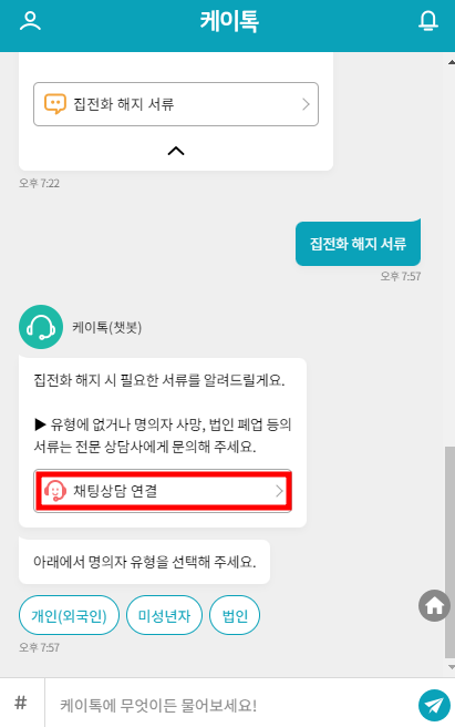 케이톡(챗봇)에 '집전화 해지'를 검색해주셨다면, KT 집전화 해지는 KT닷컴, 플라자, 고객센터를 통해서 해지를 할 수 있다는 내용이 나옵니다. '집전화 해지 서류'를 클릭해주신 다음 아래의 개인(외국인), 미성년자, 법인 3가지 중 하나를 선택하여 '채팅상담 연결' 버튼을 클릭하시면 됩니다.