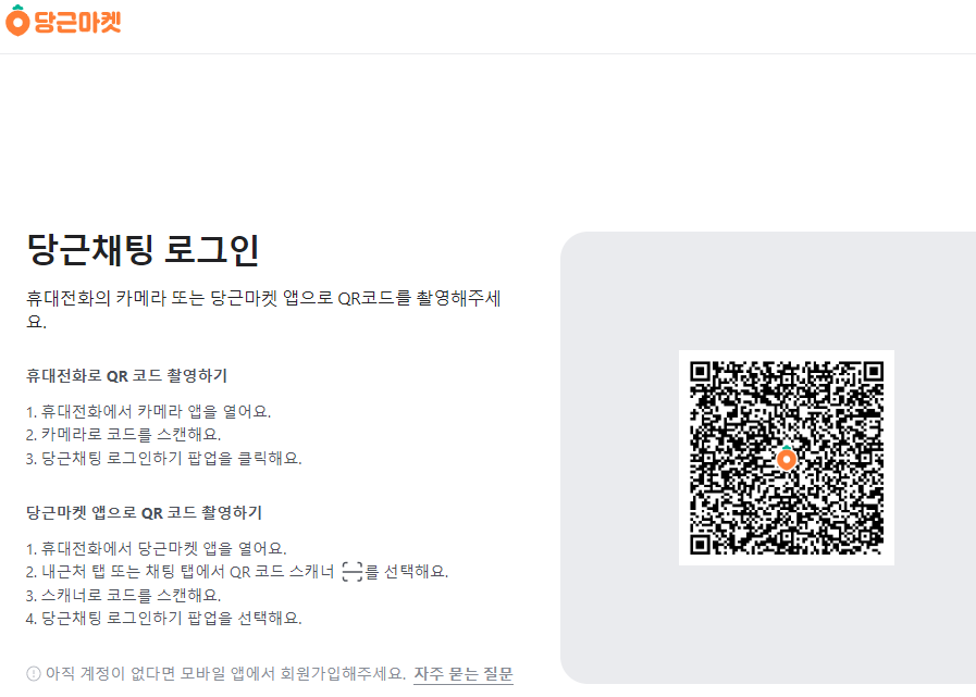 '채팅하기' 버튼을 클릭하셨다면, 당근 채팅 로그인 창이 나오며, 휴대폰(모바일)의 카메라 또는 당근마켓 앱을 통해서 QR코드를 촬영해주시면 됩니다.