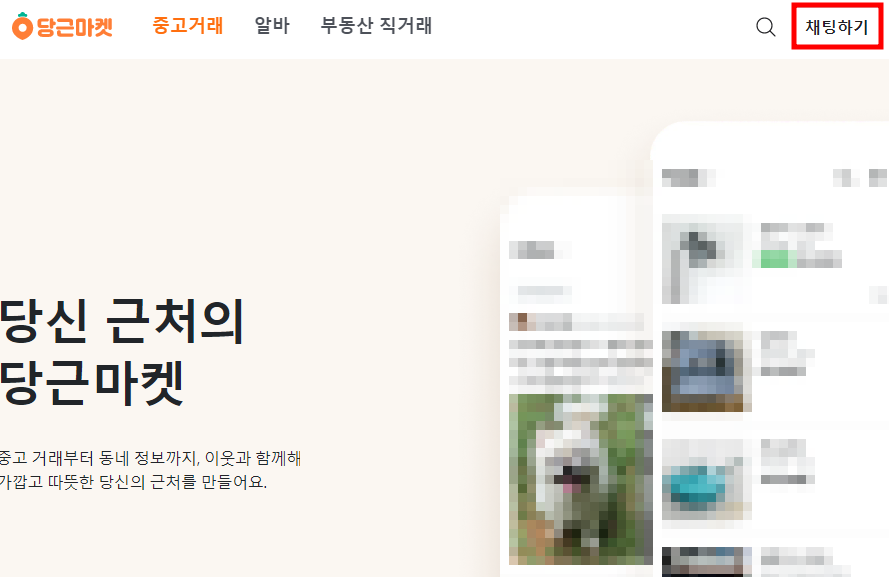 '당근마켓 공식 홈페이지'를 클릭하셔서 당근마켓 공식 홈페이지에 들어간 다음 오른쪽 위의 상단에 '채팅하기'를 클릭해주시면 됩니다.